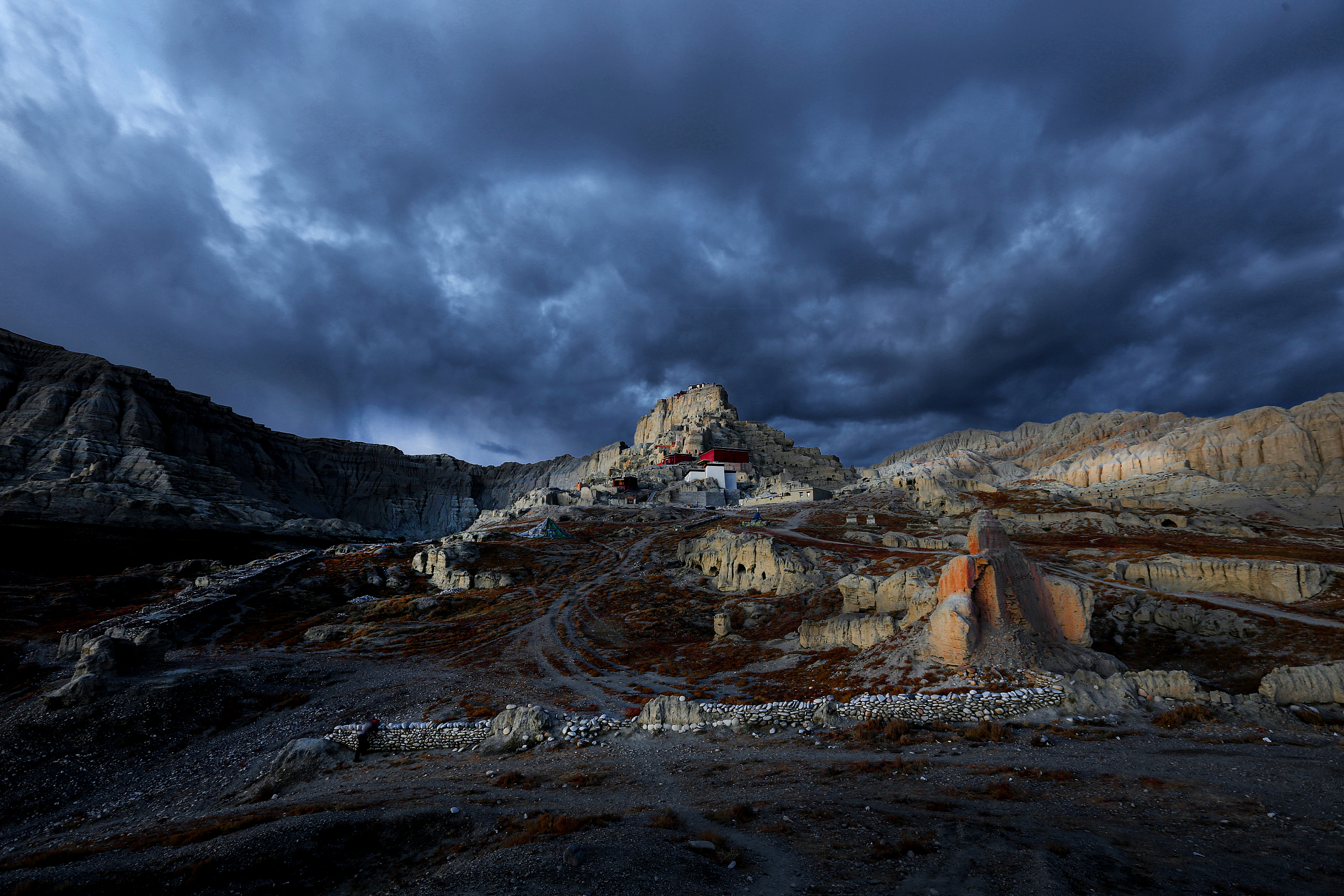 从塔钦出发,步行约2-3小时,在第一个明显的爬升路段之前,你会看到河谷对岸山崖上的曲古寺。这里通常是转山者的第一个休整点。补给站就设在寺庙下方靠近河滩的平地上,由当地藏民搭建的简易帐篷或板房经营。